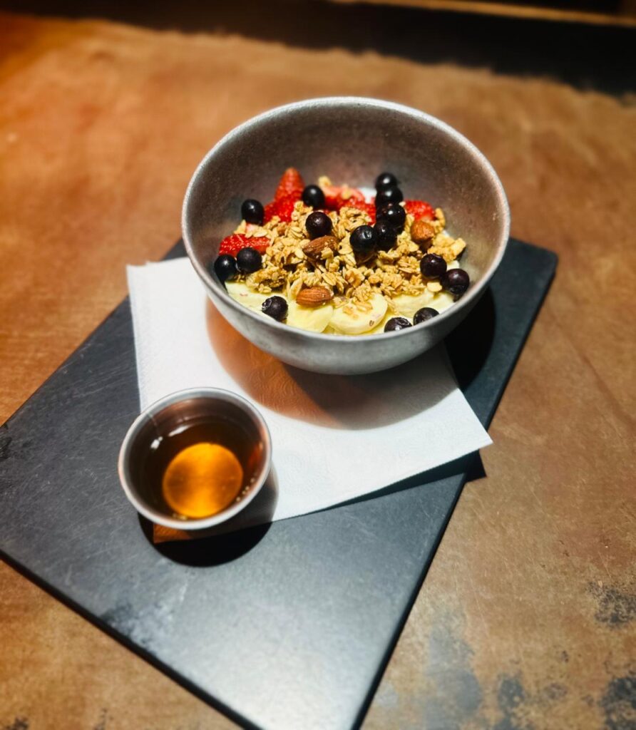 Bowl de yogurt griego con granola, frutillas, banana y arándanos. Con miel aparte.