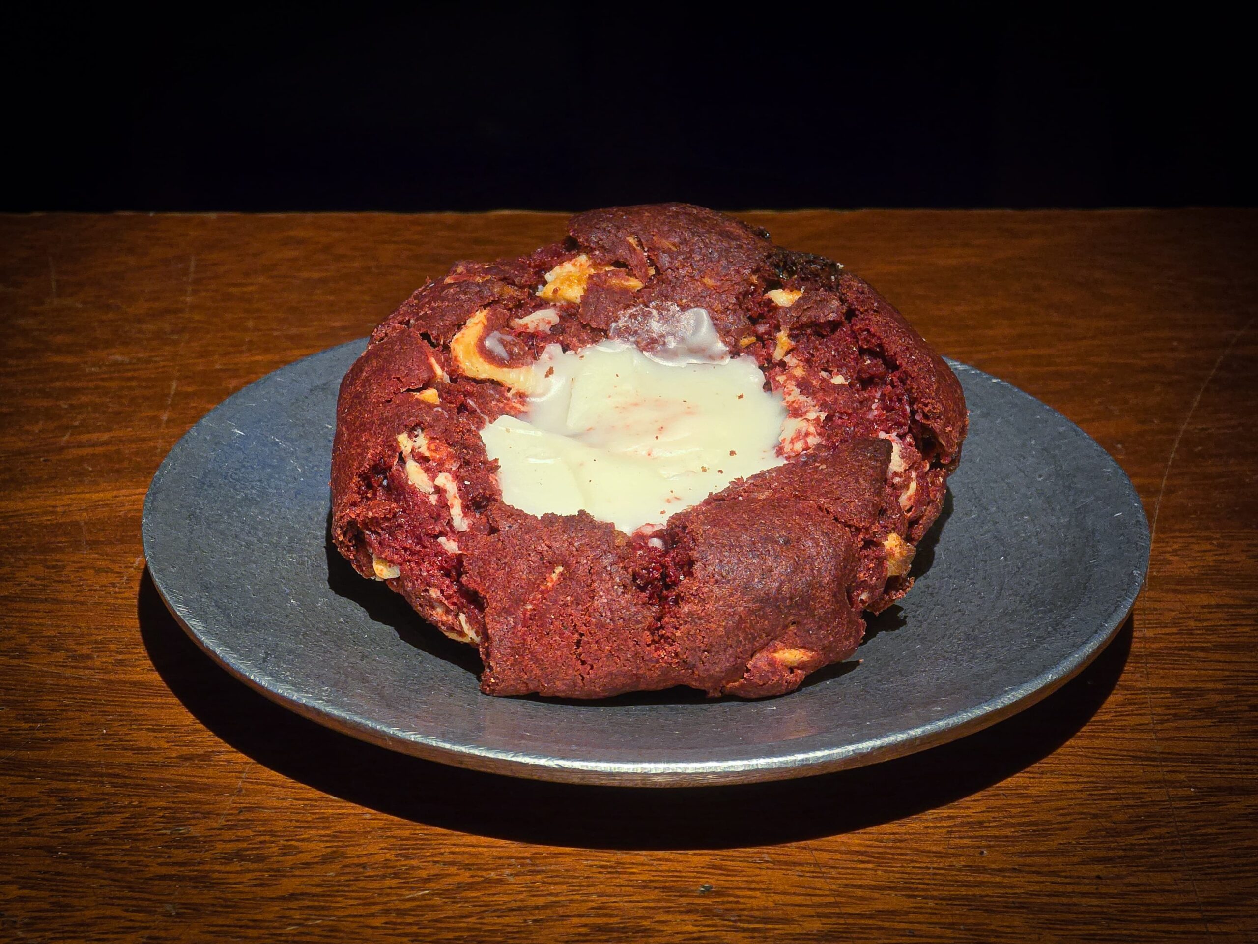 Cake de portobello relleno de cheddar, tomate, rúcula y guacamole en pan de remolacha.