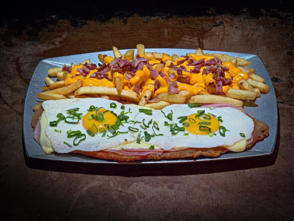 Milanesa de ternera para compartir con filetto, jamon, muzzarela, huevos fritos y papas fritas con cheddar panceta y verdeo